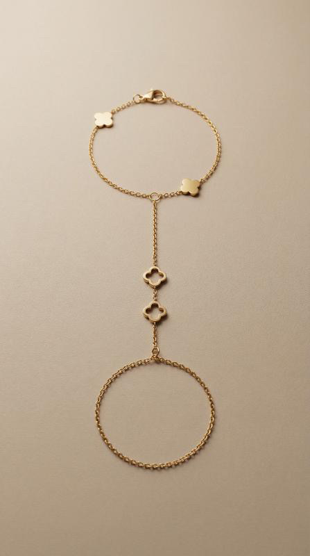 Elegant gold clover hand bracelet for a chic, feminine look.
